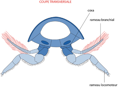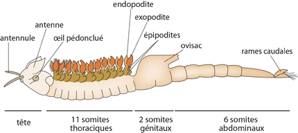 Observons le dessin suivant. Malgré des aspects très divers, tous les membres de cette Classe possèdent comme caractéristique d'avoir des appendices aplatis : l'exopodite et l'endopodite sont des palettes bordées de poils, et l'épipodite, aplati lui aussi, sert de branchie (d'où le nom de la Classe : les Branchiopodes).