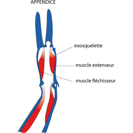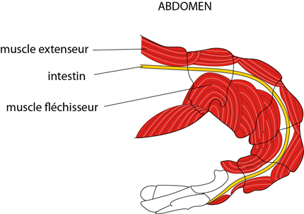 Chez l'Ecrevisse armée d'un céphalothorax rigide, les mouvements se réduisent à ceux de l'abdomen et des appendices. Prenons l'abdomen, par exemple: le groupe de muscles extenseur est dorsal, et le groupe de muscles fléchisseurs est ventral; c'est lui qui fait se replier violemment la partie postérieure de l'abdomen sous le corps lorsque l'Ecrevisse veut s’échapper, à reculons.