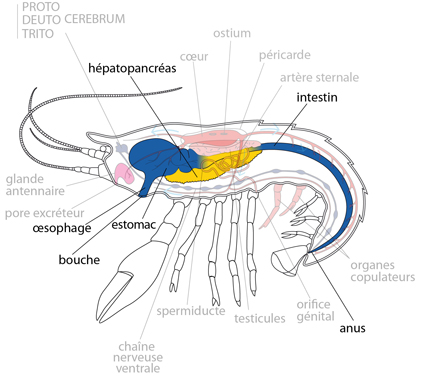 Le stomodeum joue un rôle dans l'ingestion, la trituration et le stockage de la nourriture. L'œsophage, non visible sur la photo, débouche dans l'estomac, très volumineux. Un étranglement divise l'estomac en deux parties; dans la partie antérieure, on trouve deux masses calcaires plus ou moins saillantes. Elles constituent une provision de sels calcaires, que l'animal utilise après sa mue, pour former sa nouvelle carapace.