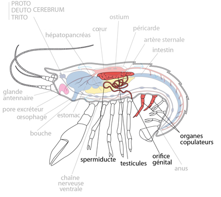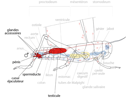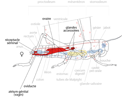 Il vous reste encore à localiser le système génital, nous avons représenté une femelle ici, et l'appareil excréteur: deux tubes de Malpighi raccordés à la jonction mésentéron-proctodeum.