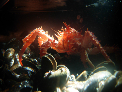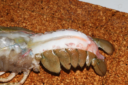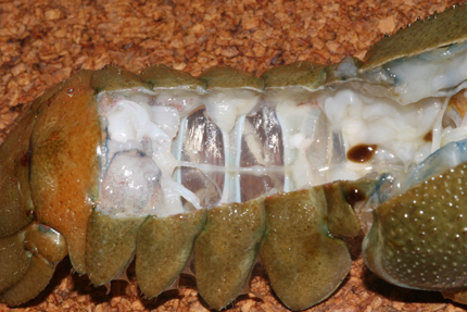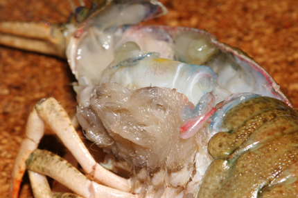 Osmorégulation et excrétion : chez la plupart des animaux, ces deux fonctions sont couplées. Les branchies, visibles ici sur la photo, ont d’autres fonctions outre la respiration: elles participent activement à l'excrétion d'un autre déchet du catabolisme, l'ammoniaque, qui est effectivement le principal détritus azoté chez les Crustacés. Les déchets azotés et le CO2 ne sont pas les seuls produits du catabolisme à excréter. Des molécules ou des particules plus volumineuses peuvent s'accumuler dans des cellules spéciales, appelées néphrocytes, circulant dans l'hémolymphe, puis se rassemblant à certains endroits du corps, notamment à la base des branchies et des appendices, qui les excrètent.