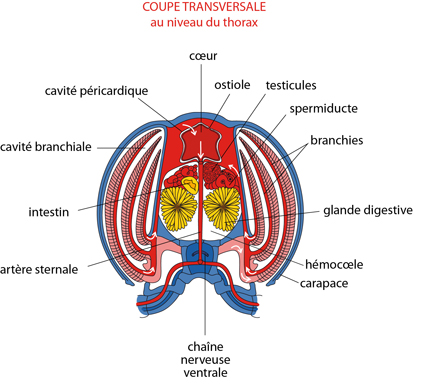 Le système respiratoire est intimement lié au système circulatoire comme le montre cette coupe transversale faite au niveau du cœur. L'hémolymphe en provenance des branchies rejoint la cavité péricardique, et rentre dans le cœur par les ostioles. Les flèches indiquent le sens de la circulation.