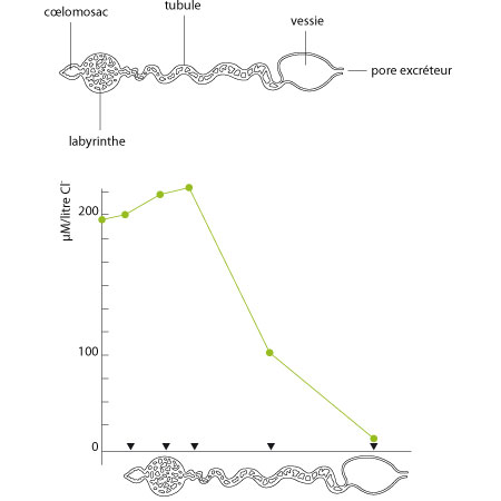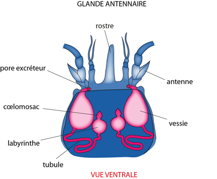 Chaque glande antennaire comprend au bout aveugle un petit sac dérivé du cœlome, le «cœlomosac». Un dispositif d'ultrafiltration somme toute assez comparable à l'ensemble lame basale-podocytes du rein des Mammifères, constitue sa paroi. (Si vous avez oublié de quoi il s'agit, allez revoir votre cours de première candi!). L'urine filtrée se retrouve dans la cavité du cœlomosac, et sera modifiée en passant dans la portion suivante de la glande antennaire: le labyrinthe, puis le tubule. L'urine définitive est stockée dans la vessie et évacuée périodiquement par le pore excréteur.