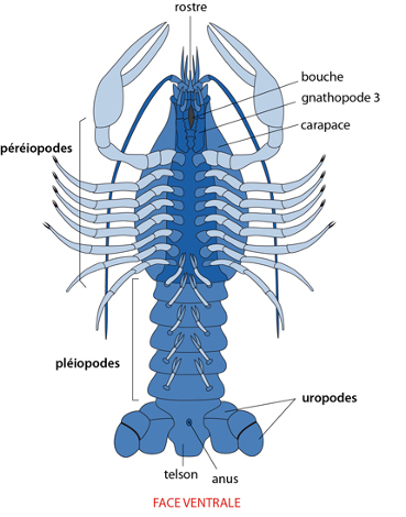 En général, il y a 20 paires d’appendices, plus un petit rostre à l'avant (formé par l'acron) et une plaque impaire au bout de l'abdomen formant le telson. De part et d'autre du telson, la dernière paire d'appendices abdominaux est transformée en uropodes servant à la nage. Les 5 paires qui précèdent s'appellent pléiopodes, sont peu développées et ont une fonction sexuelle. Plus en avant, et articulées au thorax, les 8 paires d'appendices se dénomment péréiopodes. Parmi ceux-ci, 5 paires de grandes pattes sont vouées à la locomotion. En se rapprochant de la partie antérieure du corps, la paire péréiopode restante a une fonction préhensile: la pince qui est diantrement puissante. En avant encore, 3 paires de pattes-mâchoires ou gnathopodes, plus petites, sont affectées à la mastication. Sur le schéma n'est visible que la dernière des gnathopodes, les « gnathopodes 3 ». Ils recouvrent les deux autres paires.