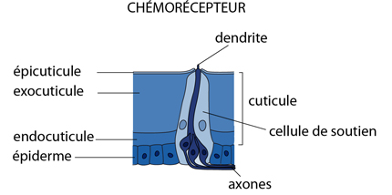 Des chémorécepteurs sont logés au fond de canaux, de fentes, qui traversent l'exosquelette, ou encore à la surface de petits poils spéciaux comme dans le schéma.
