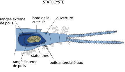 L'Ecrevisse est renseignée sur sa position dans l'espace lors d’un déplacement par une paire de statocystes, localisés dans l'article de base des antennules. Les statocystes sont de simples invaginations sphériques de l'exosquelette, dont le creux contient des grains de sable agglomérés par les sécrétions de la paroi du sac. Cette paroi est tapissée de petits poils sensoriels. Selon la position de l'animal, les grains de sable se déposeront sur telle ou telle partie de la surface interne du statocyste et stimuleront donc les poils correspondants. Puisque le statocyste est une invagination de l'exosquelette, la cuticule est évacuée à chaque mue avec le contenu. Chaque fois, l'Ecrevisse doit donc y réintroduire des grains de sable.