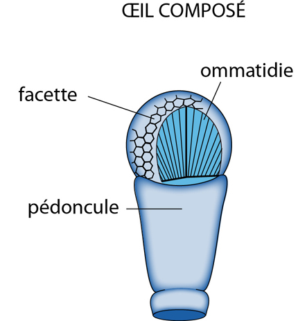 Chaque unité cylindrique, dénommée ommatidie, est couverte extérieurement par une cornée transparente dérivée de la cuticule. La cornée fonctionne comme une lentille. La surface externe de la cornée, la facette, présente un contour hexagonal.