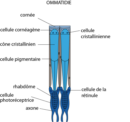 Les éléments photorécepteurs proprement dits sont localisés juste en-dessous du cône. Ils forment la rétinule. Le centre de la rétinule est occupé par un cylindre transparent, le rhabdome, autour duquel se disposent les cellules photoréceptrices allongées. On dénombre 8 cellules photoréceptrices. La surface interne de chacune est garnie de microvillosités orientées perpendiculairement à l'axe du rhabdome. La membrane plasmique tapissant les microvillosités renferme les pigments photo-sensibles. Les 8 ensembles de microvillosités se font face et constituent le rhabdome. Les cellules photoréceptrices sont en fait des neurones très modifiés: leurs dendrites correspondent à la zone porteuse de microvillosités, et leurs axones se dirigent vers les ganglions optiques localisés dans les pédoncules oculaires; l'information y est analysée, puis transférée vers les centres optiques du protocerebrum.
