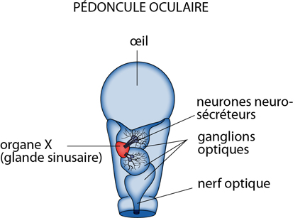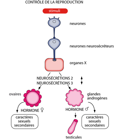 Les neurosécrétions (toujours via l'organe X) inhibent le développement des ovocytes en-dehors des périodes de reproduction. Lorsque la saison est favorable, cette neurosécrétion décline. Une autre neurosécrétion, stimulante cette fois, apparaît et les œufs se développent. Pareillement, chez le mâle, les neurosécrétions contrôlent le fonctionnement des glandes androgènes situées au bout des spermiductes. Les hormones de ces glandes stimulent les testicules et l'apparition des caractères sexuels mâles. A titre de curiosité: bien sûr, le sexe est déterminé génétiquement mais si l'on extirpe les glandes androgènes, les testicules se transforment en ovaire, et les caractères mâles disparaissent. Inversement, si l'on greffe des glandes androgènes chez des femelles, celles-ci se transforment en mâles fonctionnels. Donc les hormones de ces glandes servent d'intermédiaire pour la détermination du sexe, entre le génome et le phénotype.