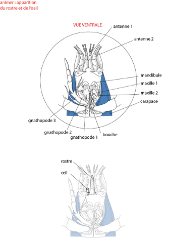 Profitons des Branchiopodes pour examiner un élément que nous n'avions pas pu observer chez l'Ecrevisse : la larve Nauplius. C'est la larve de base des Crustacés, et nous l'évoquerons encore par la suite. L'oeil nauplien, tache sombre médiane en avant de la tête, est l'organe photorécepteur.