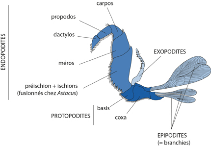 C'est un appendice biramé. Une partie basale, le protopodite porte 2 rames terminales: l'endopodite ou rame interne, et l'exopodite ou rame externe. Le protopodite porte des branchies et correspondent au rameau branchial. Au cours de l'évolution des Crustacés, des expansions lamellaires plus ou moins complexes ont garni l'un ou l'autre segment du protopodite, et ont servi à des fonctions diverses: aider à la mastication, à la nage, au transport des œufs. A ces expansions, on a donné le nom général d'épipodites. Le basis du protopodite porte les deux rames. La rame externe, ou exopodite comporte un segment basal et un distal constitué de nombreux articles. Ce plan de base, illustré avec les troisièmes gnathopodes d'Astacus, varie presqu'à l'infini chez les Crustacés. Il est déjà très modifié sur les autres appendices de l'Ecrevisse, en fonction du rôle qu'ils ont à remplir.