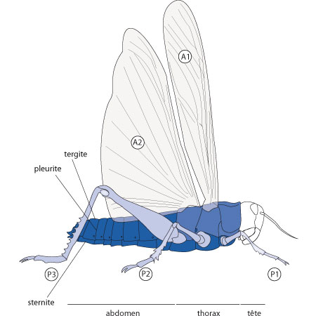 Puisque les ailes sont des évaginations du tégument, elles sont constituées de deux feuillets de cuticule. Le long d'une nervure, les deux cuticules sont épaissies, et séparées par une trachée; donc, on obtient une lumière tubulaire et de part et d'autre, deux renforcements cuticulaires; ainsi les nervures constituent un renfort squelettique efficace. Les nervures de l'aile s'ouvrent dans l'hémocoele, et sont emplies d'hémolymphe (c'est elle qui fait s'épanouir les ailes après la mue, en emplissant progressivement les nervures).