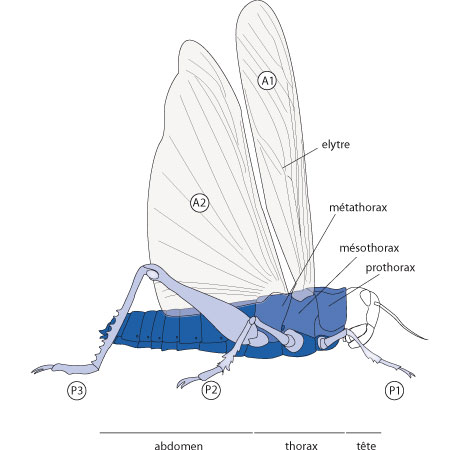 Le thorax du Criquet comprend 3 métamères, appelés respectivement dans le sens antéro-postérieur: prothorax, mésothorax et métathorax. Chacun de ces segments porte une paire de pattes, et les deux derniers portent en outre chacun une paire d'ailes. Les ailes sont insérées entre le tergite et le pleurite. L’origine des ailes n’est pas encore clairement définie. Les insectes les plus primitifs ne possèdent pas d’ailes, ce sont les Aptérygotes. Les insectes ailés sont appelés les Ptérygotes. Une première hypothèse en fait des expansions du tégument, indépendantes d’organes locomoteurs et acquises bien plus tard au cours de l’évolution. Une autre hypothèse les fait dériver d’une transformation complète des organes locomoteurs utilisés pour la marche. Il s’agirait d’une modification du rameau locomoteur ou d’un exopodite et de sa migration vers le haut, au niveau des pleurites. Les ailes antérieures sont appelées élytres chez le Criquet; leur rôle dans le vol est négligeable et se situe surtout dans la stabilisation de l’animal, et la protection des ailes postérieures en les recouvrant quand l'animal est au repos. Les ailes postérieures ont une surface considérable, et le Criquet les replie lorsqu'il atterrit. Ce sont les instruments du vol, et des nervures les renforcent.