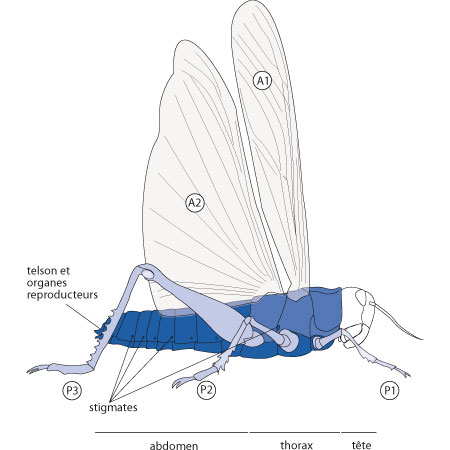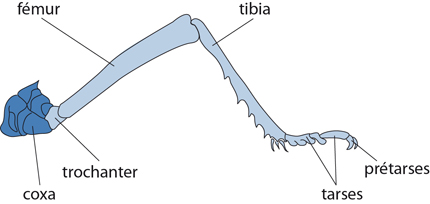 Voyons maintenant les pattes. Les trois paires sont construites sur le même plan, mais leur taille et leur orientation sont variables: la première dirige la marche, le deuxième soutient le corps, et la troisième propulse; chez le Criquet, cette dernière est extrêmement développée et permet à l'animal de sauter. Chacune d'elles comporte à la base un coxa; un trochanter fait l'articulation du coxa avec le fémur; un tibia, un tarse et un pré-tarse muni de griffes. Cet examen externe du thorax démontre bien que cette partie du corps s'est spécialisée dans la fonction de locomotion, que ce soit le vol, le saut ou la marche.