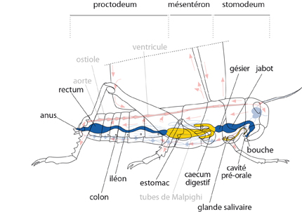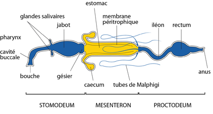 Le tube digestif présente des régions stomodéale (antérieure) et proctodéale (postérieure) très longues, colorées en bleu sur le dessin. Ces parties sont pourvues d'une cuticule et sont donc d’origine ectodermique. En cela, le tube digestif des arthropodes diffère de celui de la plupart des autres animaux. Seule la partie moyenne, ou mésentéron possède un épithélium d'origine endodermique, ici en jaune.