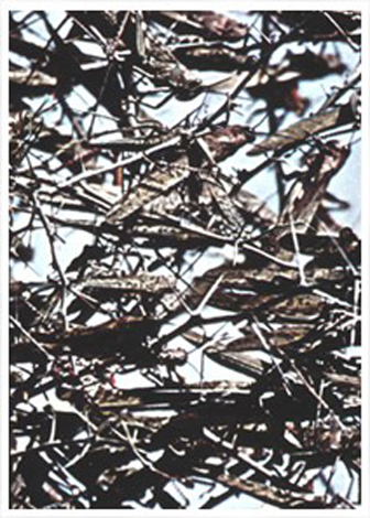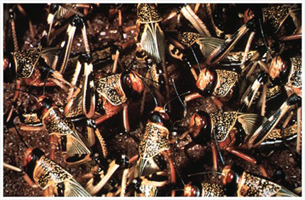 Sous l’influence des contacts entre individus, les criquets subissent des transformations hormonales et la forme grégaire apparaît après deux ou trois générations, capable de voler en essaim sur de longues distances et de causer en quelques heures des dégâts irréparables aux cultures. La photo montre un rassemblement de Criquets sur un arbuste; ils l'ont complètement défeuillé.