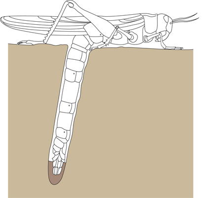 Chez la femelle, l'abdomen se prolonge par un ovipositeur, un organe solide qui lui permet d'introduire ses œufs dans le sol. Chez le mâle, des plaques génitales maintiennent la femelle pendant l'accouplement.