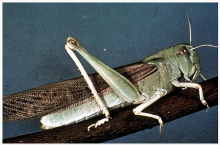 Notre second exemple-type de l'Embranchement des Arthropodes, nous le prenons dans la Classe des Insectes. Les Insectes sont aussi appelés « hexapodes » parce qu’ils possèdent 6 pattes au stade adulte. Voici le Criquet migrateur appelé Locusta migratoria, ou encore Locuste. Ce Criquet migrateur marche, saute, vole. Il existe sous une forme solitaire et sous une forme grégaire qui peut effectuer des déplacements sur des distances considérables de plusieurs centaines, voire milliers de kilomètres. Le passage d’une forme à l’autre est lié aux conditions climatiques. Après de fortes pluies en région aride, la végétation se développe brutalement. Les criquets disposent alors d’une abondance de nourriture et se multiplient, les densités de la population augmentent et ils se transforment en forme grégaire. Avec leur multiplication et la réapparition de la sécheresse, la végétation diminue à nouveau et les criquets se concentrent alors dans les seules zones restées vertes. Quand la densité de la population diminue la forme grégaire peut se retransformer en forme solitaire.