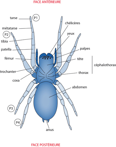Comme indiqué ici, la bouche ventrale est encadrée de 2 paires d'appendices, les chélicères et les pédipalpes. Les chélicères sont les pièces buccales typiques des Araignées. Chaque chélicère se compose d’une tige mobile articulée au céphalothorax et d’un crochet dur.