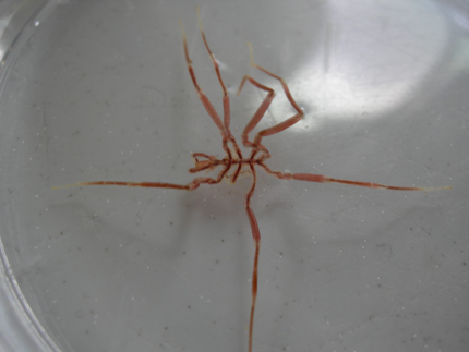 Les Pycnogonides, parfois appelés araignées de mer possèdent un proboscis proéminent et sont caractérisés par une extrême réduction de l’abdomen, ce qui les rend aisément reconnaissables. Il n’y a ni organe d’excrétion, ni organe de respiration, ce qui est compensé par un très grand rapport en surface sur volume du corps. Une particularité du groupe, les mâles recueillent les ovules fécondés sur leurs ovigères jusqu’à l’éclosion. Il s’agit d’une forme de soins parentaux exercée par les mâles. Connaissez-vous des exemples dans d’autres groupes animaux ? On connaît près de 1300 espèces de Pycnogonides ayant colonisé toute une série d’habitats marins même s’ils restent discrets et relativement peu abondants. Il en existe par exemple sur les côtes de la mer du Nord.