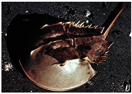 Les Xiphosures sont le plus ancien groupe de la classe des Mérostomes, et celui qui a duré le plus longtemps. Leur nom signifie «dont la queue est une épée». La Limule que vous voyez appartient à l’une des 7 espèces existant encore actuellement. De nos jours, on les trouve sur le sable, le long des côtes atlantiques de l'Amérique du Nord et le long des côtes pacifiques de l'Asie où elles viennent pondre leurs œufs lors des marées d’équinoxe. Elles peuvent atteindre une cinquantaine de centimètres.