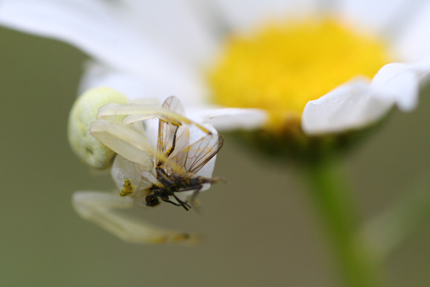 Quand l'araignée attaque une proie prise au piège dans sa toile, elle ouvre ses crochets, écarte au maximum ses chélicères l'une de l'autre, puis elle les resserre dans le corps de sa victime et lui injecte une dose de poison qui la paralyse aussitôt. Chez l'homme, la morsure de l'Epeire ne provoque qu'une réaction superficielle sans gravité. C’est le cas de la majorité des araignées, certaines ne parviennent même pas à percer la peau humaine. Cependant, une minorité d’entre elles peuvent provoquer des piqûres douloureuses et dans quelques rares cas, la mort: pensez à la Veuve noire! En plus du venin, le canal interne aux chélicères laisse passer une sécrétion salivaire enzymatique puissante, qui provoque une liquéfaction rapide des tissus.