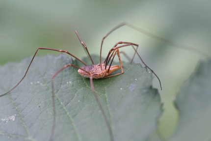 Vous connaissez tous les Faucheux ou Opilions, ces sortes d'Araignées inoffensives très maladroites sur leurs grandes pattes. En fait, c'est un ordre d'Arachnides où l'abdomen n'est plus réuni au céphalothorax par un pédicule étroit : le corps forme une seule masse globuleuse.