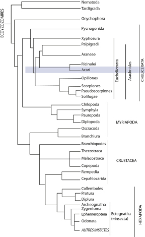 Les Chélicériformes sont composé d’une part des Pycnogonides et d’autre part des Euchélicérates. Les relations phylogénétiques sont représentées dans la figure. Nous allons faire une brève description des groupes principaux.
