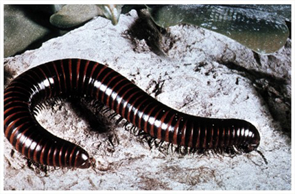 Les myriapodes, familièrement appelés Mille-pattes, sont caractérisés par une série d'appendices locomoteurs tous semblables, mais articulés cette fois. Les segments post-céphaliques sont très nombreux, semblables et on ne peut pas distinguer le thorax de l’abdomen. Les Myriapodes sont formés de plusieurs Classes distinctes. Les Chilopodes qui disposent d’une parie de pattes par segment, les Diplopodes, où l’on en compte deux, les Symphyles et les Pauropodes. Ici, les échanges gazeux se font par des trachées. Rappelez-vous quels autres groupes présentes cette particularité ?
