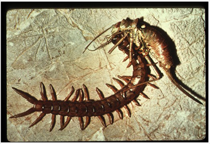 Parmi les Chilopodes, nous trouvons par exemple la Forcipule de cette photo, ou encore ce Scolopendre prédateur. Ils ont de nombreux appendices, mais nettement moins qu'une centaine. Ces petits animaux montrent un mélange intéressant de caractères primitifs et de caractères évolués. La tête est petite et globuleuse; vous la voyez ici en photo.