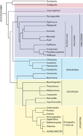 Vu leur abondance et la diversité des formes, la systématique des Panarthropodes est complexe, il ne nous sera pas possible de décrire tous les groupes. Par contre, nous allons tenter de répondre à nos trois questions de base et nous allons donner une vision la plus synthétique possible de ce que l’on connaît de leur positionnement phylogénétique actuel.