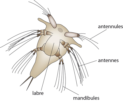 Au sortir de l'oeuf, cette larve planctonique, nageuse, ne possède que trois paires d'appendices: les antennules, les antennes et les mandibules. Les longs poils qui garnissent les deux dernières paires servent à la natation. Un labre impair démesuré se situe en avant de la bouche, à la face ventrale. On ne distingue aucune segmentation externe.