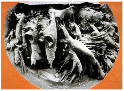 Cette photographie au microscope électronique à balayage montre un minuscule ostracode de 520 millions d'années. La présence d'une carapace est en elle-même une protection pour un petit animal, et les petits Ostracodes, constamment présents par leurs restes fossiles depuis le Cambrien jusqu'à nos jours, ont su en retirer le maximum d'avantages. Vous voyez les appendices articulés et une valve. La carapace durcie s'étend pour former une minuscule coquille bivalve, ressemblant assez fort à celle d'une Moule. Les Ostracodes n'ont pas un grand intérêt évolutif; ils sont cependant utiles au stratigraphe en tant que fossiles repères, notamment pour la prospection pétrolière. Leurs petites coquilles se conservent bien et diffèrent d'une couche géologique à l'autre.