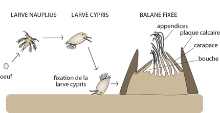 Le schéma suivant représente leur cycle de vie. Au sortir de l'oeuf, la larve de Cirripède est une nauplius tout à fait ordinaire; au fur et à mesure de ses mues successives, elle se transforme en un petit organise enfermé dans sa carapace, la larve Cypris, mais ses antennes différencient une glande gluante. Cette larve nageuse se fixe alors à un support, et s'établit tête en avant et sens dessus-dessous. En plus de sa carapace normale, la Balane secrète autour de son corps des plaques calcifiées, aux angles saillants.