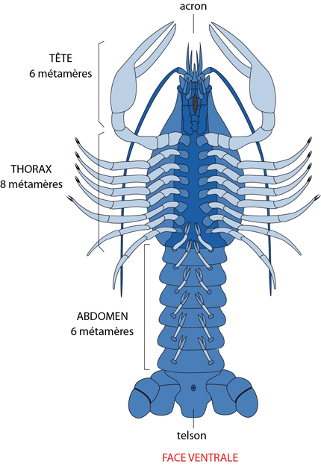 Chaque segment porte une paire d’appendices biramés, c’est-à-dire composés d’un rameau branchial et d’un rameau locomoteur. Au cours de l’évolution, ces segments vont subir une spécialisation régionalisée selon deux processus : la perte de fonction de l’un des deux rameaux de l’appendice, et la fusion de certains segments. Ainsi, la tête est le résultat de la fusion d’une série de segments dont les appendices locomoteurs se sont transformés en appendices sensoriels ou en pièces buccales.