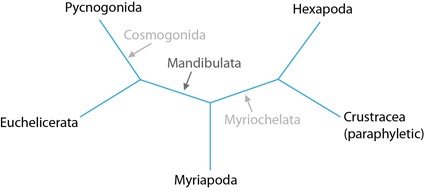 Au sein des Euarthropodes, la plupart des auteurs sont maintenant d’accord sur la monophylie des espèces possédant des mandibules et rassemblées dans le groupe des Mandibulates, alors que les espèces possédant des chélicères forment le clade des Chélicérates. Les Myriapodes sont également considérés comme un groupe monophylétique que cela soit sur le plan des analyses moléculaires ou sur le plan morphologique.