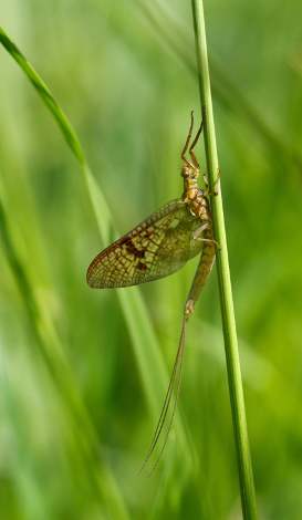 Les ailes elles ne sont capables que d'un mouvement vertical et ne peuvent être rabattues sur l'abdomen quand l'animal est au repos. Les Ephémères tirent leur nom de leur cycle de vie. Les larves vivent et croissent dans l'eau pendant des périodes qui atteignent 3 ans. Au terme de sa vie aquatique, la larve remonte à la surface, sa cuticule se fend sur le dos et libère un adulte ailé. La seule fonction de ce dernier est de s'accoupler au plus vite. Souvent, le laps de temps vécu dans le milieu aérien n'excède guère une journée. Les pièces buccales de l'adulte aérien sont atrophiées ; de toutes manières, il serait incapable de se nourrir.