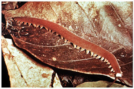 Il existe 80 espèces d’Onychophores (porteur d’ongle), toutes vivent en région tropicale. Il existe deux familles, les Peripatidae (voir photo) et les Peripatopsidae qui diffèrent par répartition géographique. Ce sont des animaux terrestres porteurs de nombreuses paires de pattes (de 14 à 43), d’une paire d’antennes munies d’yeux à la base. Animal étrange des litières forestières, voici un Péripate. Son nom signifie «qui déambule», même racine que pour la dénomination de certaines dames qui arpentent les trottoirs. Dans les forêts tropicales humides, si on fouille la masse des feuilles en décomposition, on peut trouver ce petit animal long de 5-6 centimètres, à peau veloutée, avec de petits yeux et de longues antennes, et de nombreuses pattes en forme de moignons se terminant par des griffes.