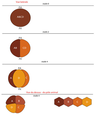 Le zygote que vous voyez latéralement est dénommé ABCD. La première division donne les blastomères AB et CD. La deuxième, les blastomères A, B, C et D. Nous verrons que le blastomère D est appelé à jouer un rôle particulier au cours de l'ontogenèse.