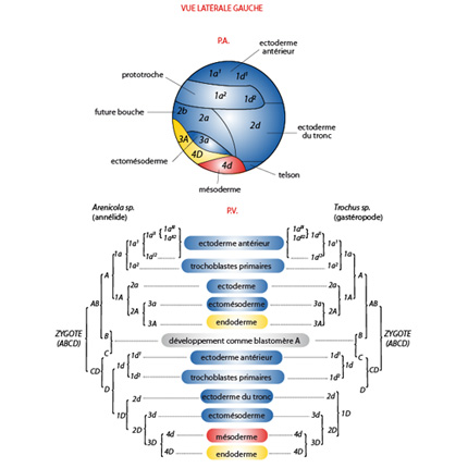 Cette figure présente une comparaison des destins des blastomères chez un Annélide, à gauche et un Mollusque, à droite. Elle veut montrer les grandes similitudes qui existent dans les stades embryonnaires précoces entre ces deux Embranchements des Lophotrochozoaires. En particulier, le blastomère 4d du stade 64 cellules sera le seul à former le mésoderme. L’endoderme proviendra de 4 cellules : 3A, 3B, 3C et 4D. Toutes les autres formeront l’ectoderme. Le schéma du dessus montre les territoires présomptifs chez une blastula. Tous les territoires, les feuillets germinatifs, y sont déterminés, ils doivent maintenant se mettre en place.