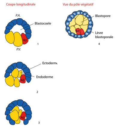 Et le blastomère 4d, qu’en est-il ? Vous le voyez en rouge sur les schémas. D'abord, il est localisé dans la paroi de la blastula, puis il se retrouve coincé entre l'ectoderme et l'endoderme, à l'extrémité postérieure. A ce moment, il se divise et les deux grosses cellules qui en résultent. On le voit sur l'image 4, qui est une vue ventrale de l'embryon. Nous y observons le blastopore, qui est cette espèce de léger enfoncement au fond duquel nous voyons les cellules endodermiques, limité par les lèvres blastoporales. Ces lèvres blastoporales sont le front des micromères bleus qui avancent vers vous et font l'épibolie. De part et d'autre du plan de symétrie de l'embryon, vous voyez les deux cellules filles (en rouge) du blastomère 4d, coincées entre l'ectoderme et l'endoderme et qui représentent le troisième feuillet embryonnaire, le mésoderme.