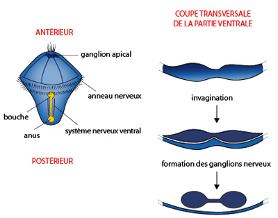 Rappelons-nous, à la fin de la gastrulation, le blastopore de la larve trochophore était très allongé ; les lèvres blastoporales sont épaissies, et deux bourrelets longitudinaux s'enfoncent sous le tégument pour former deux cordons : la principale ébauche du système nerveux.